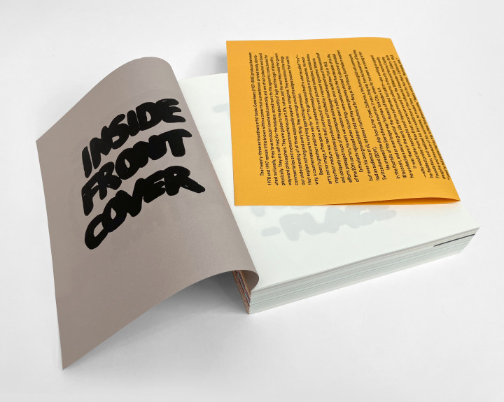Selfcover, section sewn with exposed spine, 624 pages 10 11/16 x 8 3/8 inches (27 x 21 cm) Insert with text by Jordan Stein Published by Ligature Press Design by Mathias Clottu Edition of 800 December 2025